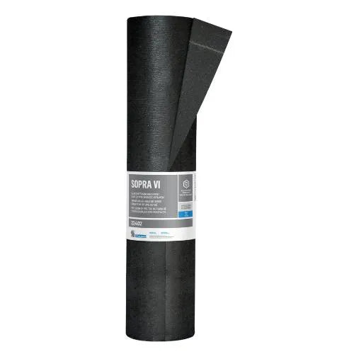 SOPRA VI is intended for use in B.U.R. roofing systems and hybrid systems that combine traditional bituminous felts with SBS-modified membranes. It is suitable for new construction and re-roofing projects on commercial, institutional, and industrial buildings. It is not intended for exposed applications and must be covered with additional plies or a protective cap sheet.