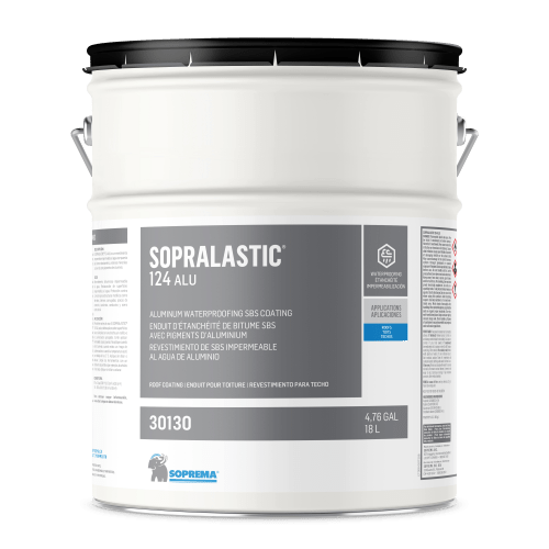 SOPRALASTIC 124 ALU is a reflective, elastomeric bitumen-based waterproofing and protective coating designed primarily for use on metal surfaces and bituminous membranes. It serves as a corrosion inhibitor for metal substrates such as sidings, corrugated steel sheets, fibre cement tanks, gutters, and ducts. Additionally, it provides UV protection for sanded bituminous membranes and previously applied SOPRALASTIC 123 coatings. Its aluminium pigmentation offers excellent reflectivity, contributing to reduced interior building temperatures and enhanced UV resistance.